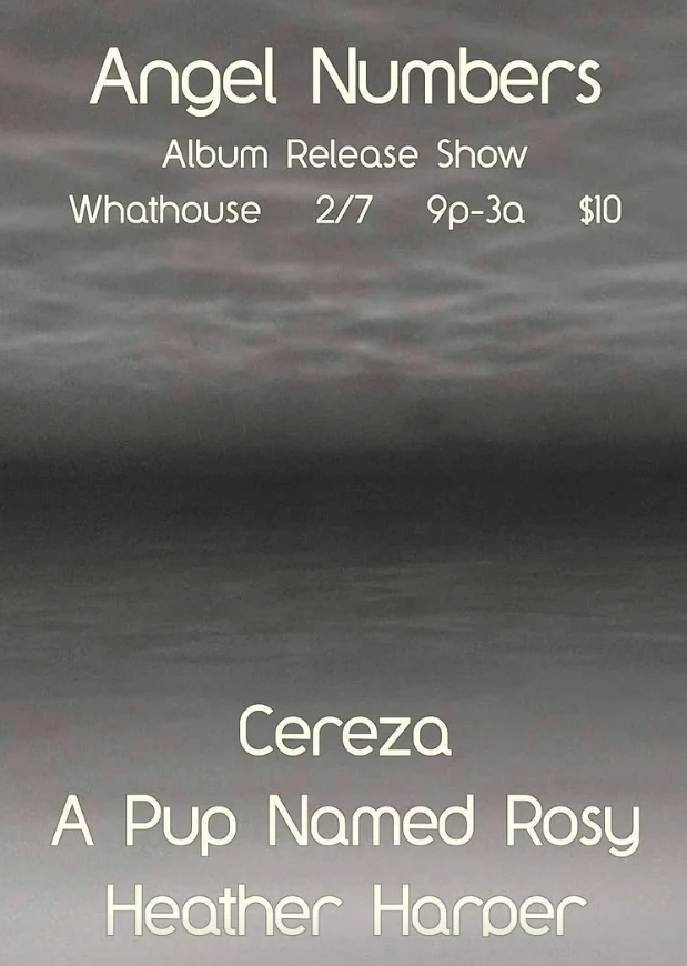 A Pup Named Rosy (album release), Cereza, Heather Harper Release party for "Angel Numbers" a new record by A Pup Named Rosy Concert Saturday, February 7, 2026 at 9:00 PM - 3:00 AM Whathouse All Ages Door: $10 / $10 Whathouse A Pup Named Rosy Cereza Online +1 more Indie Electronic Experimental