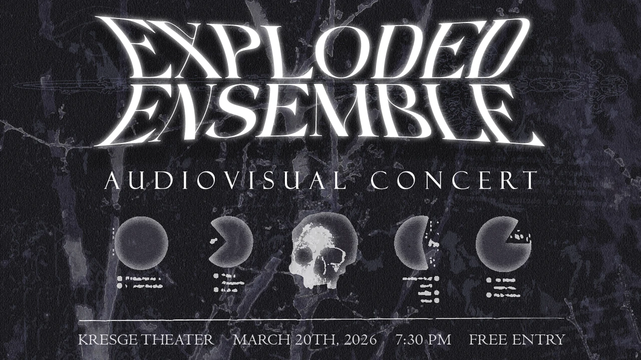 Exploded Ensemble: Audiovisual Concert Free audiovisual performance by student artists at Kresge Theater. Concert Friday, March 20, 2026 at 7:30 PM Kresge Theater All Ages Kresge Theater Audiovisual Electronic Experimental