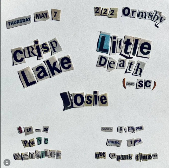 Crisp Lake / Little Death / Josie 222 Ormsby Ave, Pittsburgh, PA 15210 Concert Wednesday, May 7, 2025 at 7:00 PM 222 Ormsby All Ages Door: $10 222 Ormsby Diy Folk Punk Indie Punk