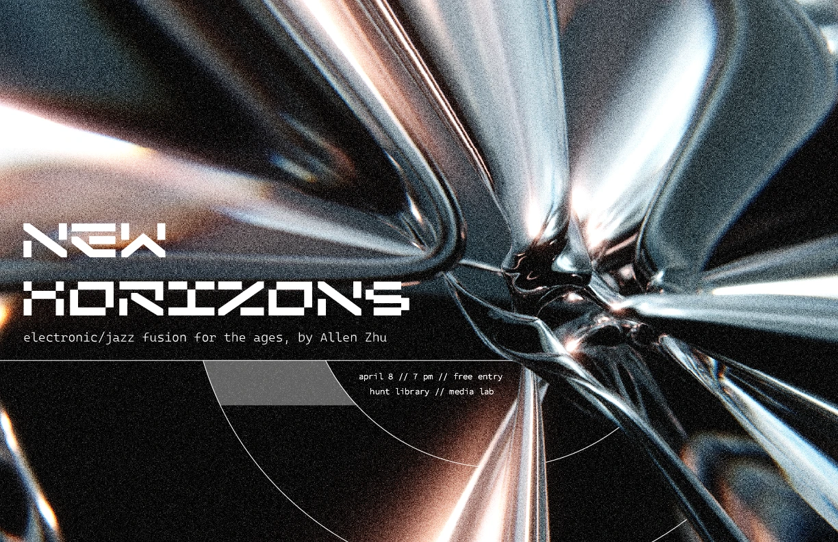 New Horizons Allen Zhu presents an electronic/jazz fusion performance at Carnegie Mellon's Hunt Library Media Lab. Concert Tuesday, April 8, 2025 at 7:00 PM Ideate Media Lab All Ages Ideate Media Lab Electronic Experimental Jazz