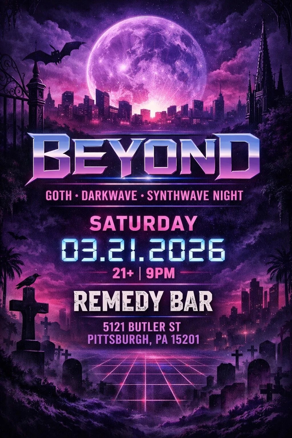 Beyond: Goth • Darkwave • Synthwave Night Goth, darkwave, and synthwave dance night at Remedy. Club Night Saturday, March 21, 2026 at 9:00 PM Remedy 21+ Remedy Goth Darkwave Synthwave