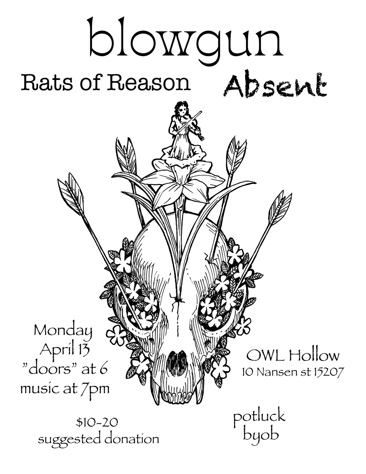 Blowgun, Rats of Reason, Absent Live music with Blowgun, Rats of Reason, and Absent at Owl Hollow Concert Monday, April 13, 2026 at 7:00 PM Owl Hollow All Ages Presale: $10 Door: $20 Owl Hollow