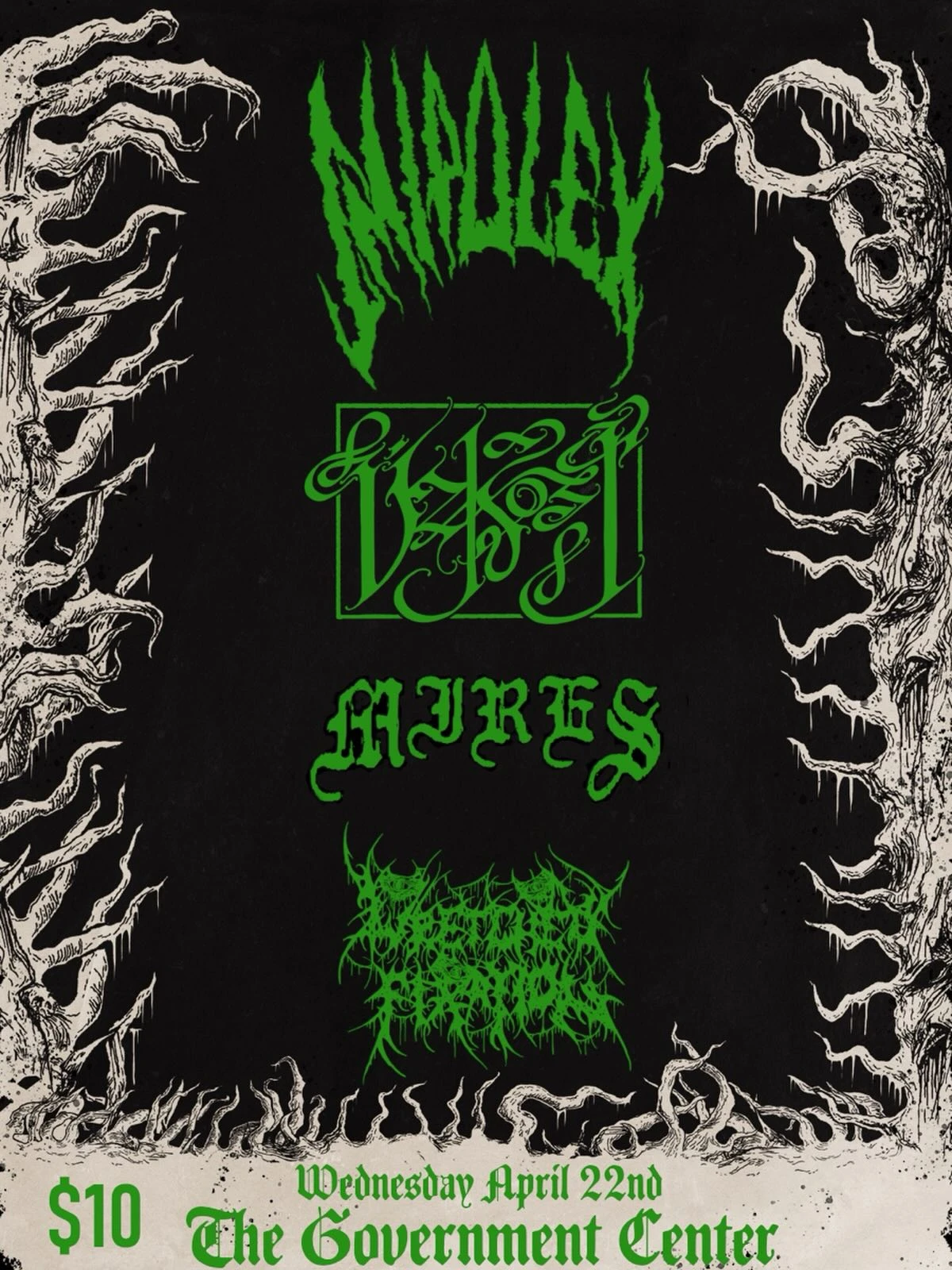Uzkost, Imipolex, Mires, Wretched Fixation Heavy underground metal lineup at The Government Center Concert Wednesday, April 22, 2026 at 8:00 PM The Government Center All Ages Uzkost Mires Wretched Fixation Black Metal Death Metal Doom Metal